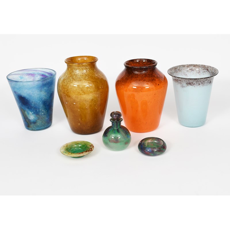 A Moncrieff Monart Ware vase, shouldered form mottled orange glass graduating to brown, cased in clear, a Monart scent bottle and stopper, A Vasrt blue glass vase, two other vases and two dishes, unsigned, 23.5cm. high, (7)