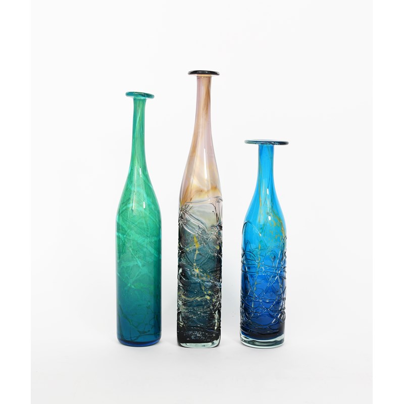 A Mdina glass bottle vase designed by Michael Harris, dated 1976 amethyst streaked glass with surface decoration, square section with tapering neck, and two other Mdina bottle vases, etched Mdina, signature and 1976, 45cm. high (3)