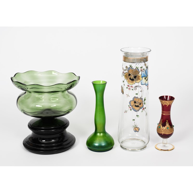 An Austrian iridescent glass vase probably Palme Koenig, compressed ovoid form with tall, swollen solifleur neck, green glass with iridescent finish, a green glass bowl probably Webb with a glass stand, a Mont Joye enamelled glass vase decorated with pansies and a Venetian glass vase, unsigned, 21cm. high (Austrian vase), (5)