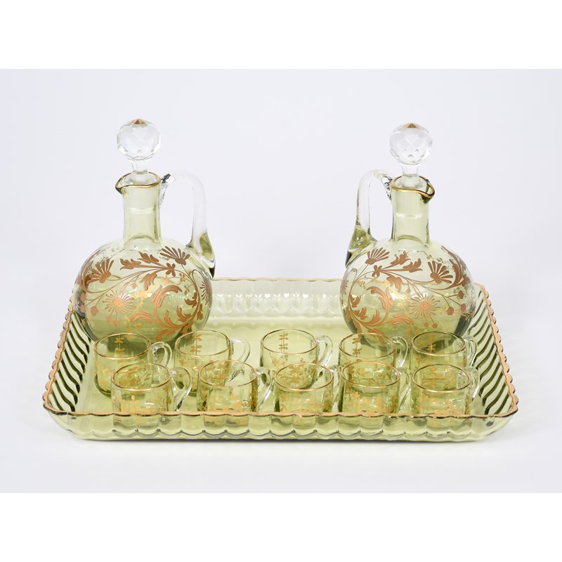 A Baccarat chartreuse glass liqueur set, green glass decorated in gilt with wild flowers, comprising two ewers with faceted clear glass stoppers, and ten tot cups, on a rectangular tray unsigned, 17cm. high (ewer's), 29cm. wide (tray), (15)