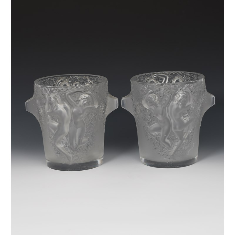Bacchantes a large modern Lalique clear and frosted glass charger, decorated to the well with three naked women amongst fruiting vine, and two modern Lalique Bacchantes wine coolers etched Lalique France, 40cm. diam. 23cm. high (coolers), (3)
