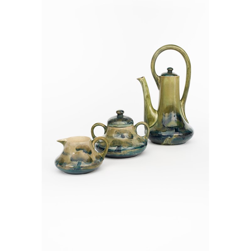 'Hazledene' a Moorcroft Pottery coffee trio designed by William Moorcroft, comprising coffee pot and cover, milk jug, sugar basin and cover, painted in shades of green and blue on a green celadon ground impressed marks, painted green signature, small chip to cover of sugar, 27cm. high (5)