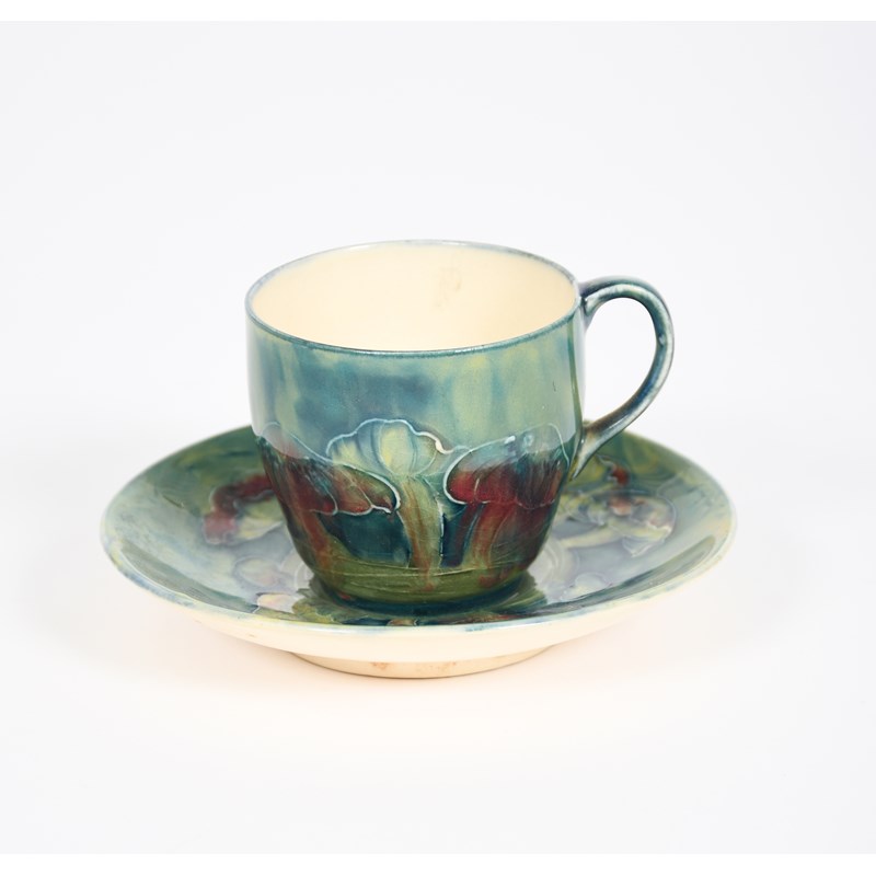 'Claremont' a Moorcroft Pottery coffee cup and saucer designed by William Moorcroft, painted in shades of red, blue and green printed and painted marks, 11.5cm. diam. (2)