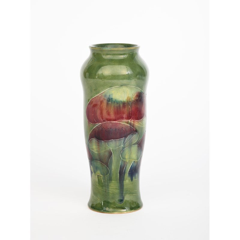'Claremont' a Moorcroft Pottery vase made for Liberty & Co designed by William Moorcroft, slender form with swollen neck, painted in shades of blue, red and green on a celadon ground printed Liberty mark, painted green signature, 19.5cm. high