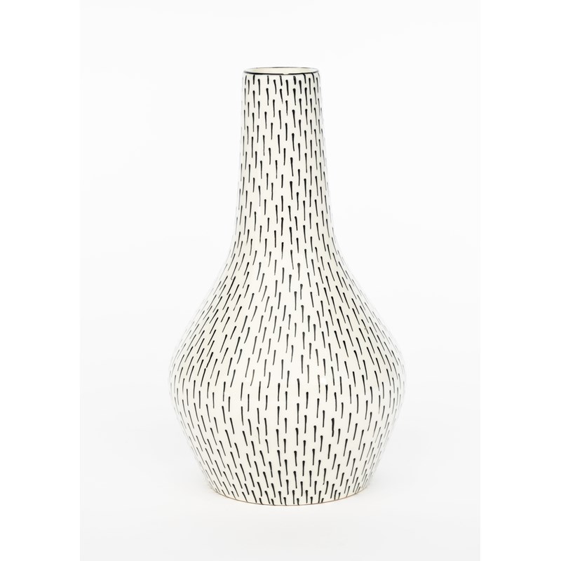 A Midwinter Pottery vase designed by Jessie Tait, ovoid with tapering cylindrical neck, tubeline decorated with black dashes on a white ground printed factory mark, 22.5cm. high