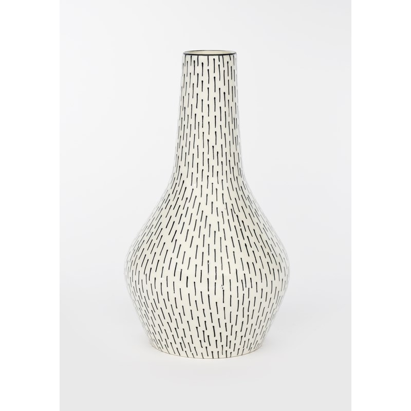A Midwinter Pottery vase designed by Jessie Tait, shouldered form with tapering neck, tubeline decorated with black dashes on a white ground printed factory marks, 23cm. high