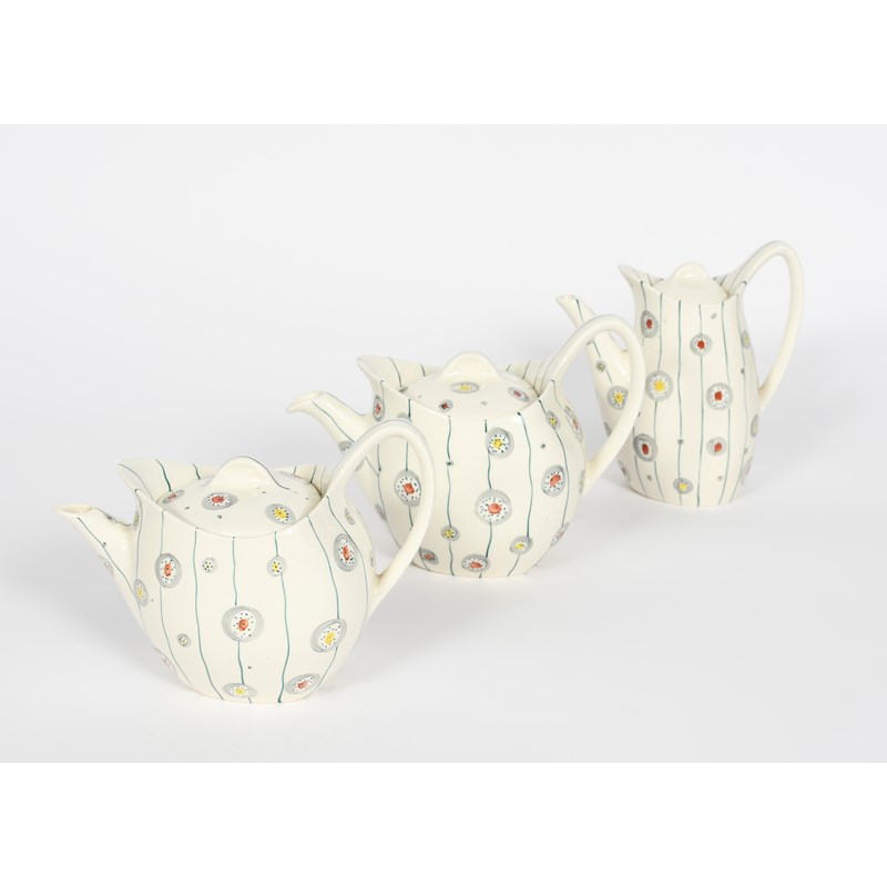 A collection of Midwinter Stylecraft Festival tableware designed by Jessie Tait, painted with atomic design in colours, including; teapot and cover, hot-water pot and cover butter dish cover, ten tea cups, nine saucers, coffee cups and saucers, slop basins and tableware printed marks, 17cm. high, (teapot), (77 pieces)
