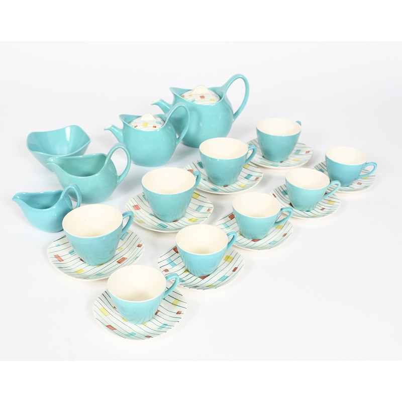 A Midwinter Stylecraft Magic Moments service designed by Jessie Tait, comprising two graduated teapots and covers, five cups, twenty saucers, eight coffee cups and nine saucers, four various jugs and two sugar basins, a Midwinter Melody coffeepot and cover, sandwich plate, and ten side plates, and six Midwinter Nature Studies plates printed factory marks, 15cm. high, (71)