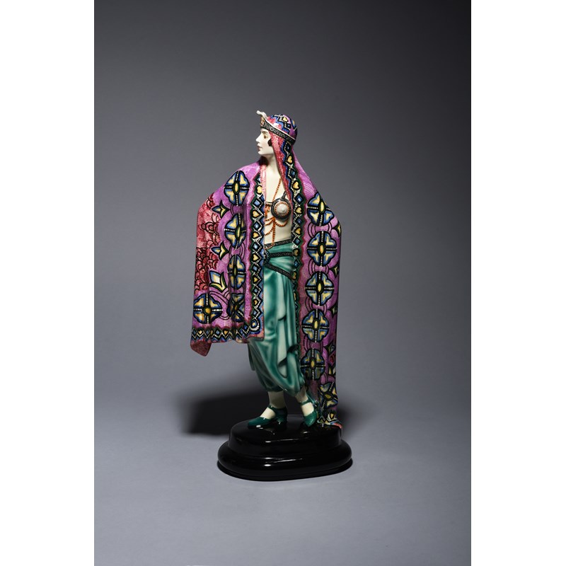 Egyptian Dancer a large Goldscheider Pottery figure designed by Josef Lorenzl, model no.5281, on rounded, stepped base, painted in colours with purple, blue and yellow geometric headdress and cape, green pantaloons and shoes, impressed and printed marks, 46cm. high