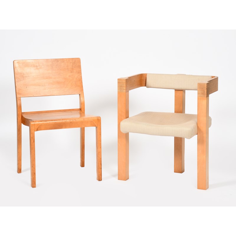 ‡A John Makepeace maple wood armchair, with laminate arm and back support, with textile back and seat pads, and a plywood chair, armchair stamped John Makepeace, 71cm. high, (2)