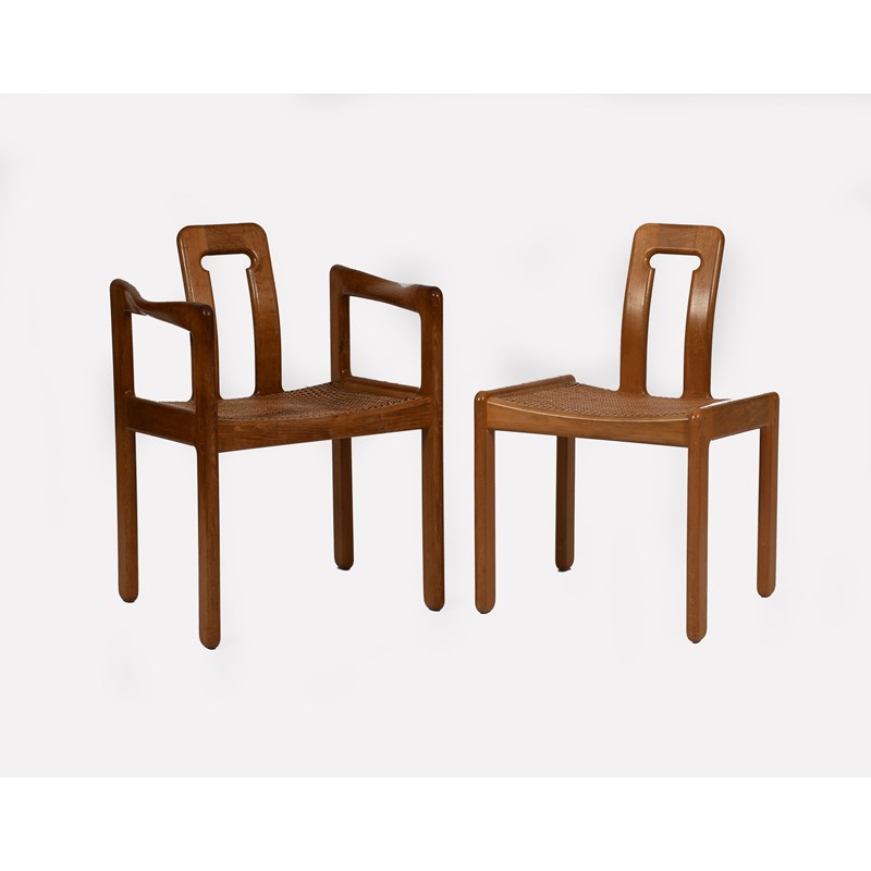 ‡A George Ingham fumed oak armchair, with cane seat, and an en suite chair 80cm. high (2)