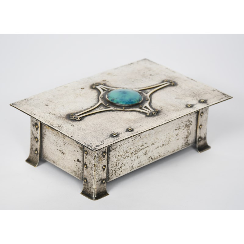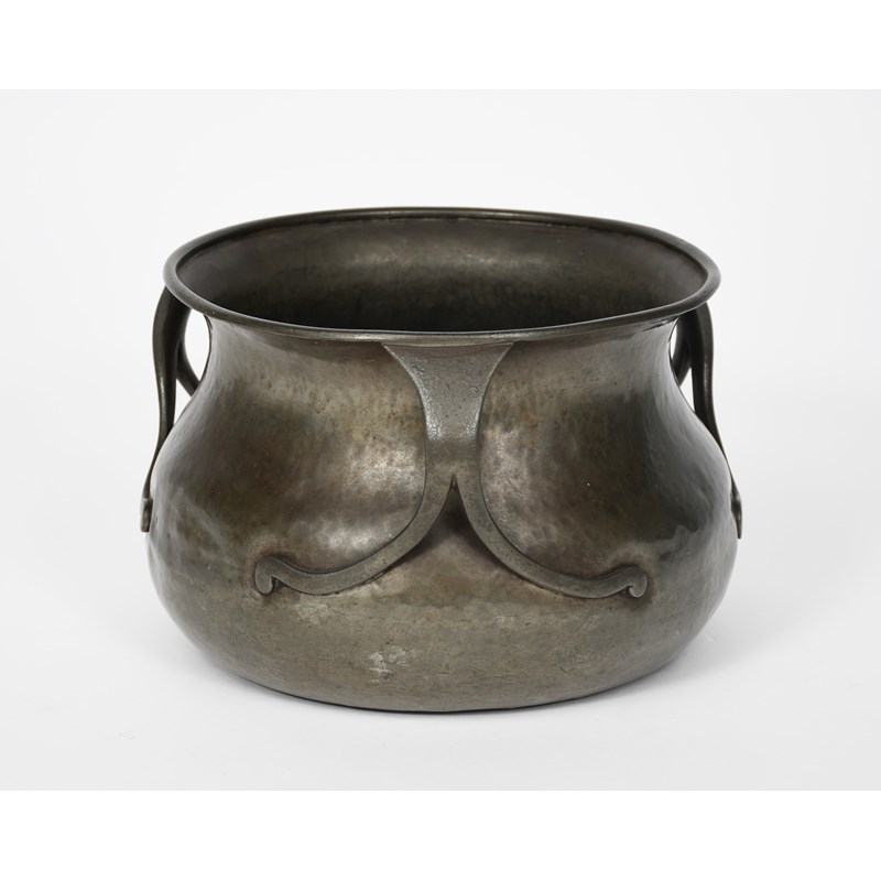 An Arts and Crafts silvered metal casket with hinged cover, in the manner of A E Jones, rectangular section with riveted strap feet, the hinged cover set with 'Ruskin Pottery' ceramic roundel inside strapwork border, and a Liberty Tudric Pewter jardiniere with three scroll handles, model no.0357 the design attributed to Oliver Baker stamped marks to Liberty Pewter piece, 23cm wide (casket), 21cm. diam. (jardiniere), (2)