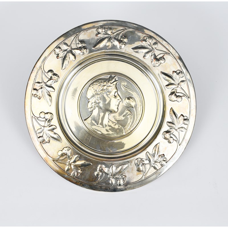 An electroplated metal charger, the well decorated with a portrait of a young male classical figure with laurel wreath, the rim a frieze of fruiting foliage unsigned, 43.5cm. diam.