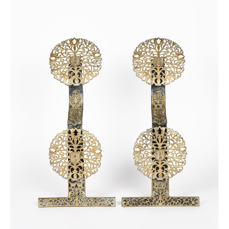 A pair of Medieval Revival brass and patinated metal fire dogs, with pierced panels of flowers and foliage unsigned, 60cm. high, (2)
