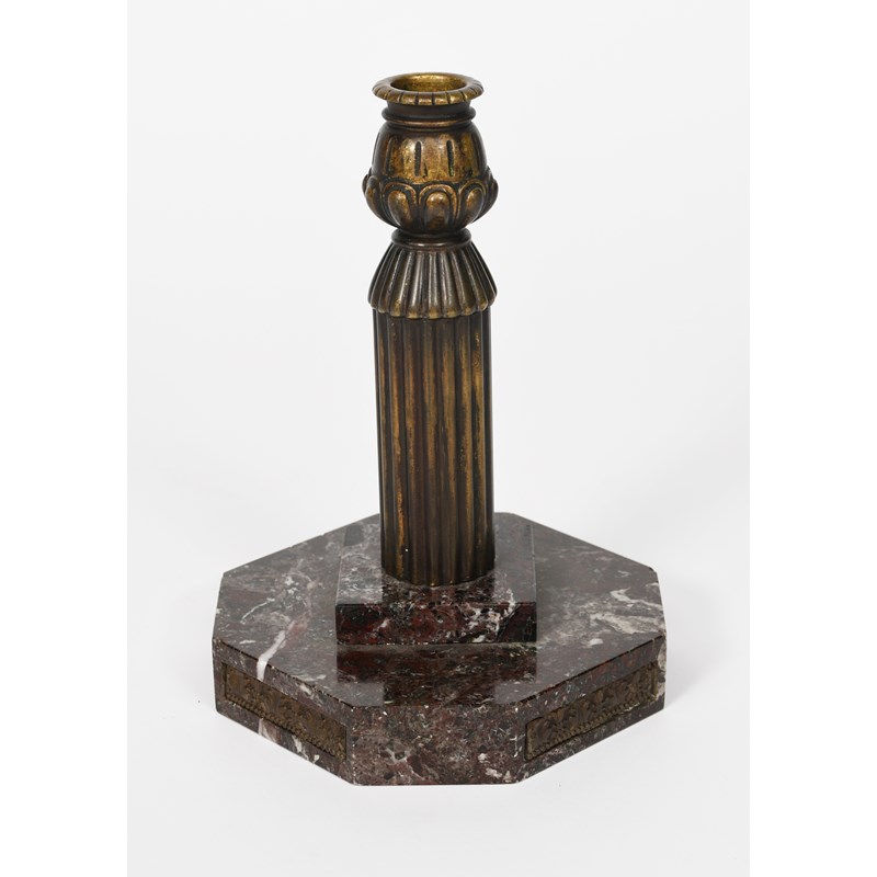 A patinated bronze candlestick on marble base designed by Gustav Gurschner, reeded cylindrical stem with swollen bud form sconce, on octagonal, stepped red marble base inset with four small bronze panels, unsigned, 21cm. high