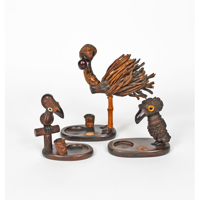 A Henry Howell & Co YZ bird, mixed exotic wood, bamboo and red phenol formaldehyde resin, modelled as a stylised ostrich, on Macassar ebony base, and two other YZ birds stamped YZ mark, 29cm. high, (3)