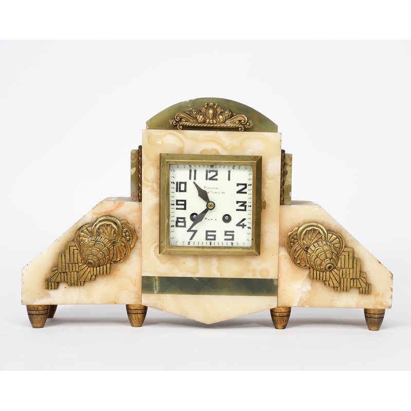 A French Art Deco onyx and bronze mantel clock, rectangular section on bronze bud feet, the onyx panelled body set with three stylised foliate panels, square section face with Arabic numerals, the dial signed Plantard Paris, 43.5cm. wide.
