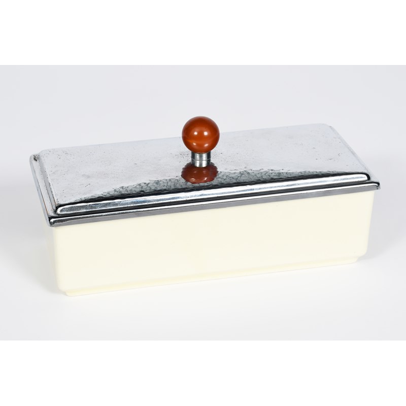 A Waechtersback pottery box with chrome metal cover, in the manner of Peter Behrens, rectangular section cream box with flat hammered metal cover with orange ball finial, printed factory mark to base, 26cm. wide, (2).