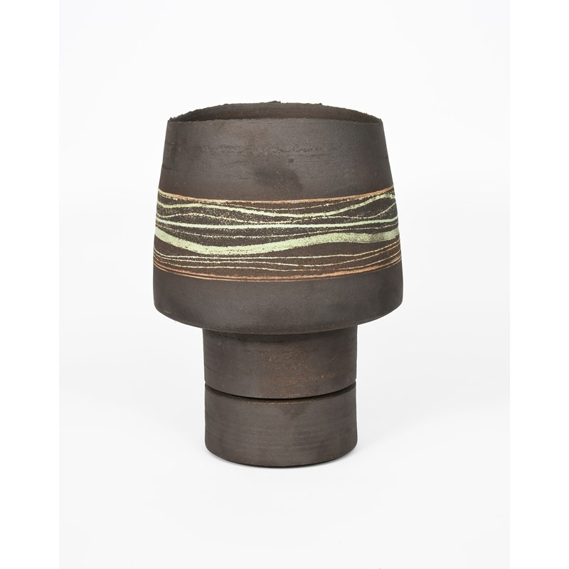 a tall stoneware vase, cylindrical form on drum foot, matt black with incised and painted banding in turquoise and buff, a smaller footed bowl, two covered boxes, a perfume bottle and six small bowls painted Hugo to base, repair to the footed bowl, 46.5cm. high (13)