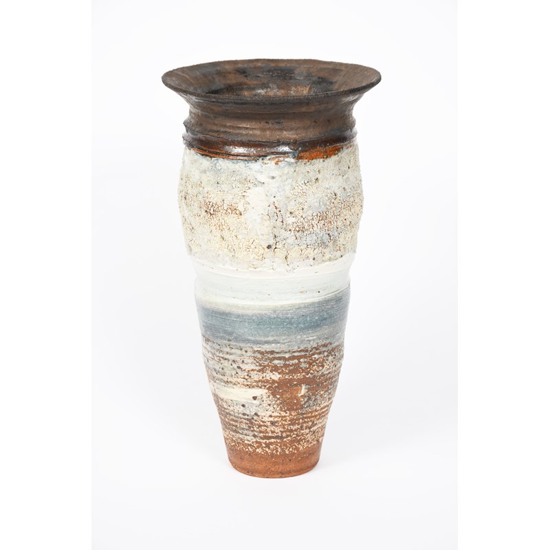 a stoneware cylindrical vase with everted rim, dated 1986, waisted, covered with textured off white glazes and pale blue band, impressed Robin Welch and 1986 to base, 34.5cm. high