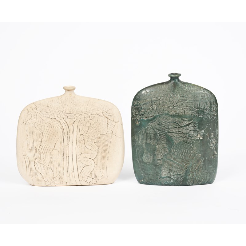 textured raku vase and another White Burnished Sack Form vase, dated 1989