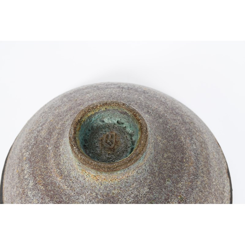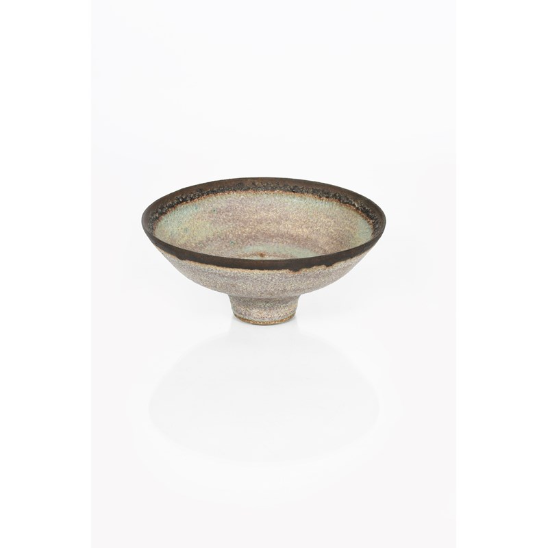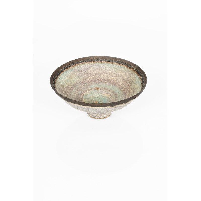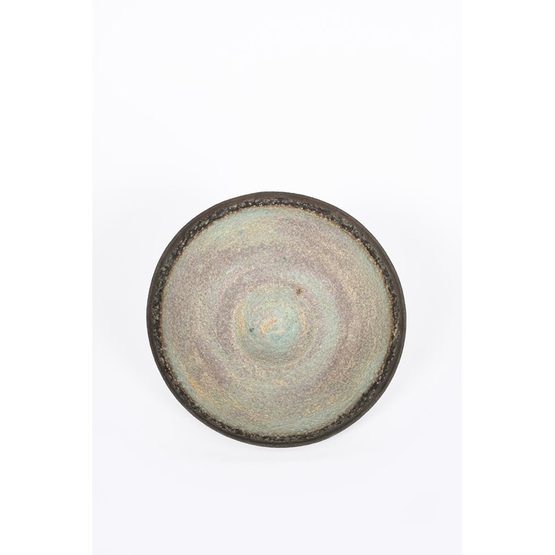a stoneware footed bowl, covered in a heather glaze, circa 1980, pitted purple and turquoise-blue glazes, beneath a dark manganese rim