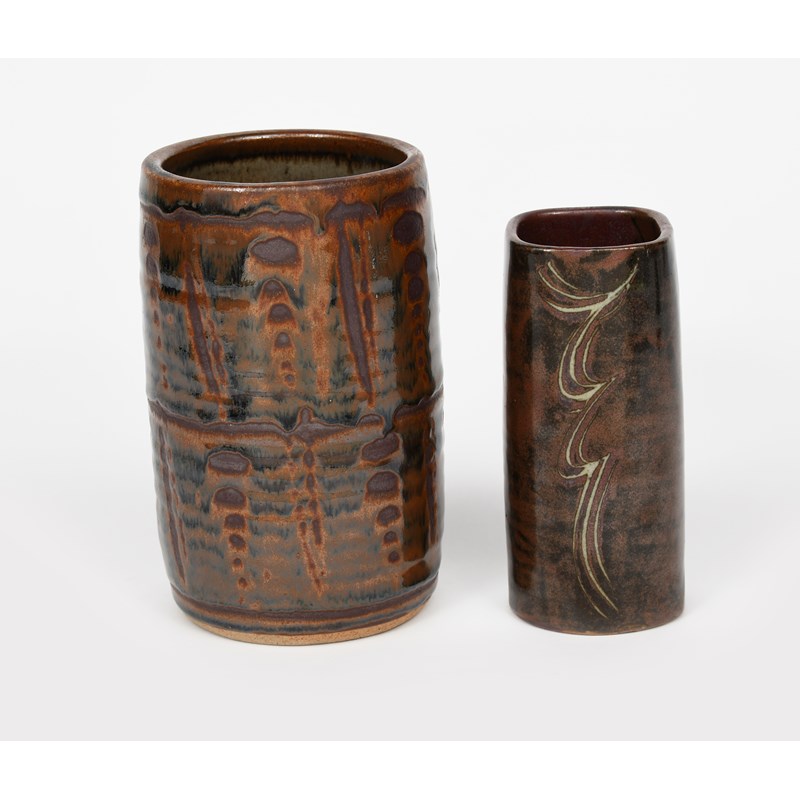 a Lowerdown Pottery stoneware vase, square section, covered in a running tenmoku glaze, one face with combed decoration, and another Lowerdown Pottery vase probably by David Leach impressed seal marks, 16cm. high (2)