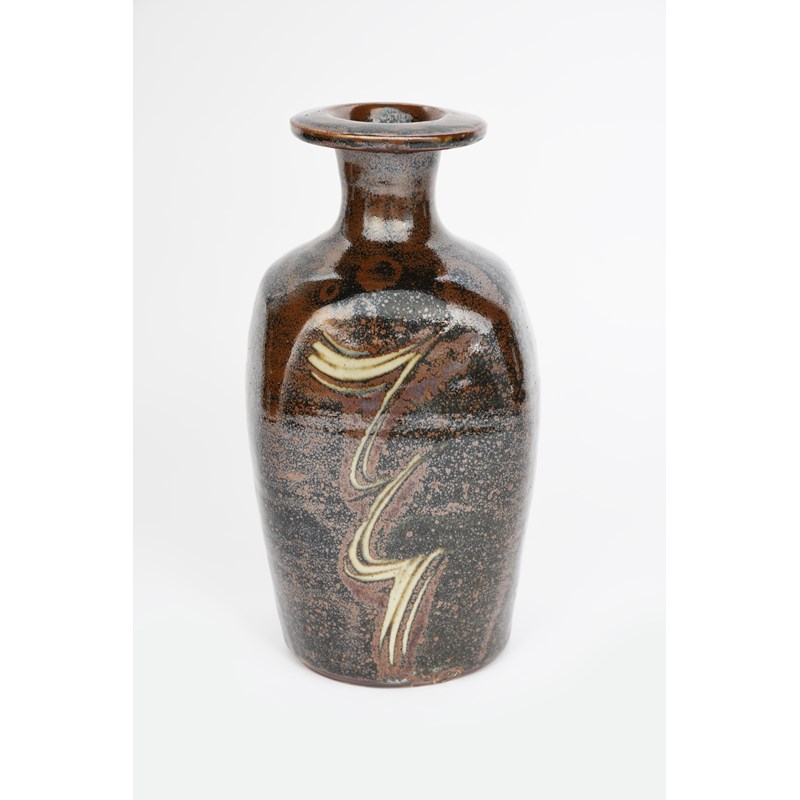 a Lowerdown Pottery stoneware vase, shouldered form with cylindrical neck and everted top rim, combed zigzag design in ash on a tenmoku ground impressed seal marks, 29cm. high