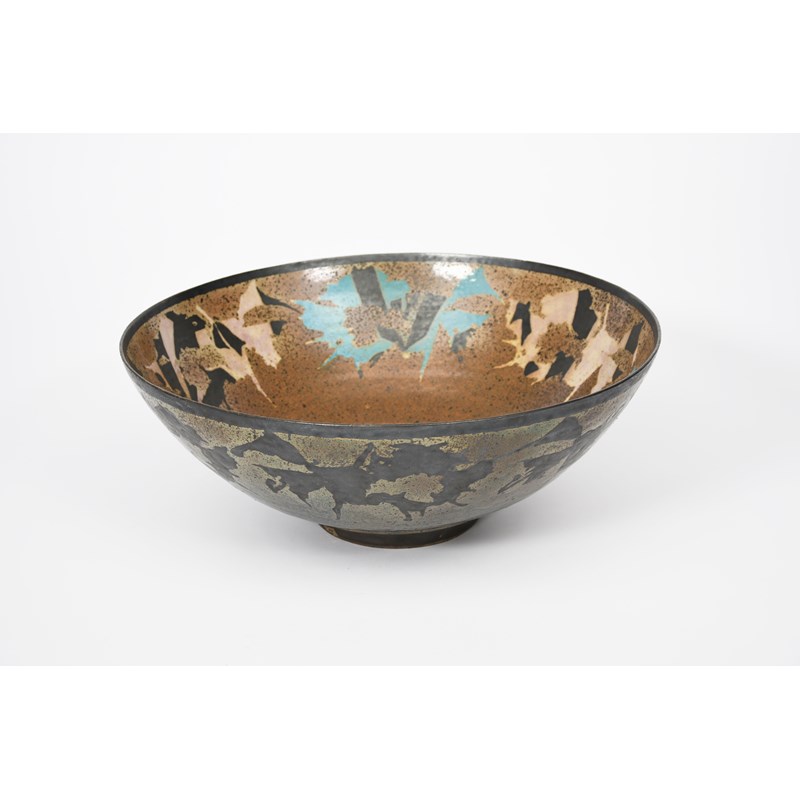 a large earthenware flaring bowl, on narrow foot, decorated with a geometric frieze in pink, blue and bronze on a speckled brown ground impressed seal mark, 39cm. diam.