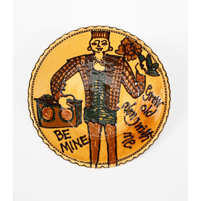 a Wharf Pottery earthenware charger slip decorated with a young woman in mini-skirt holding a beatbox, in colours applied pottery label, 37cm. diam.