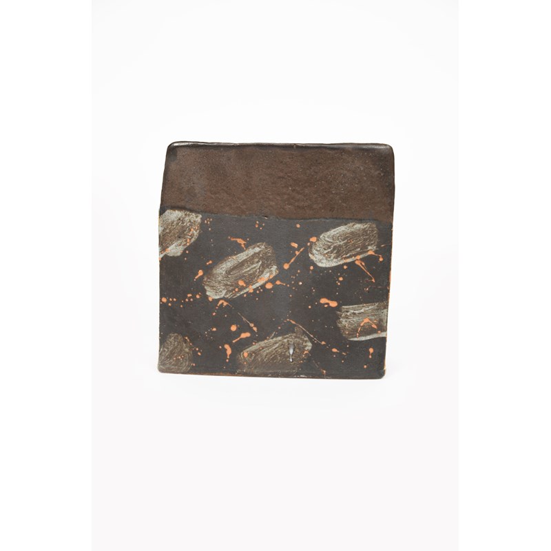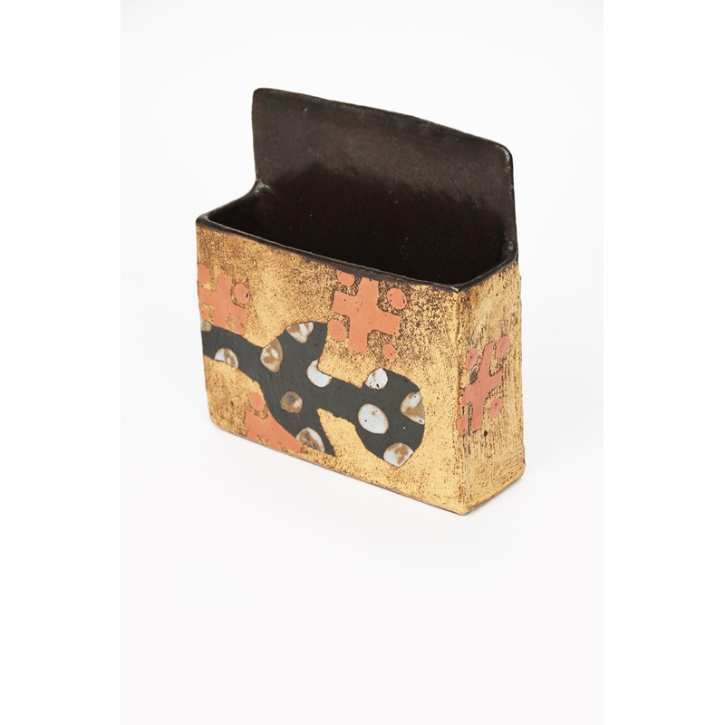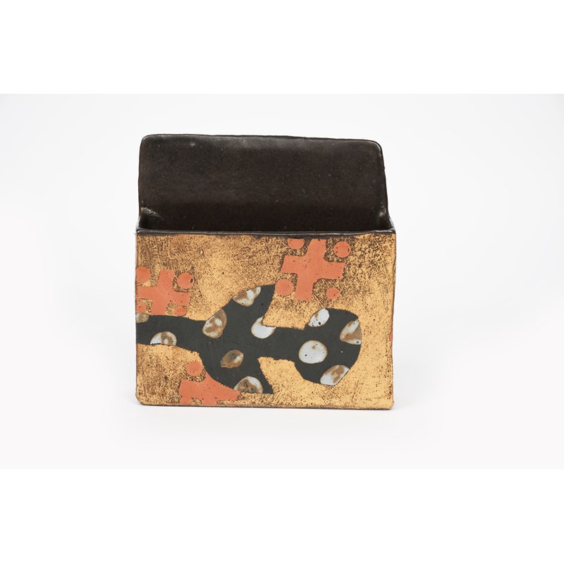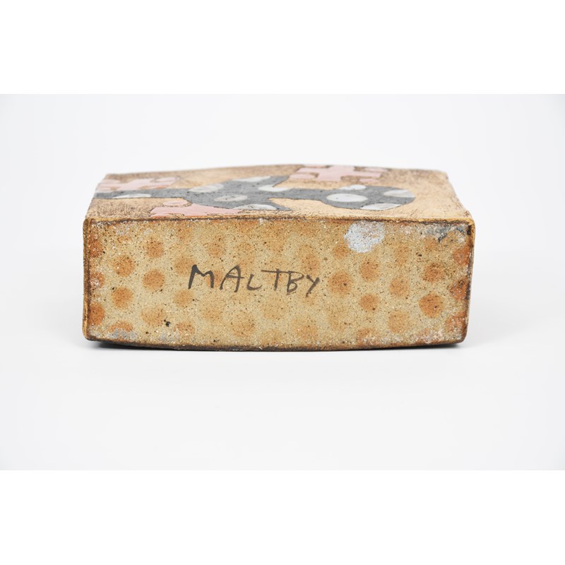 a stoneware letter box, painted with a bird motif in black and white amidst red enamelled crosses, painted Maltby, 18.5cm. wide, 18.5cm. high