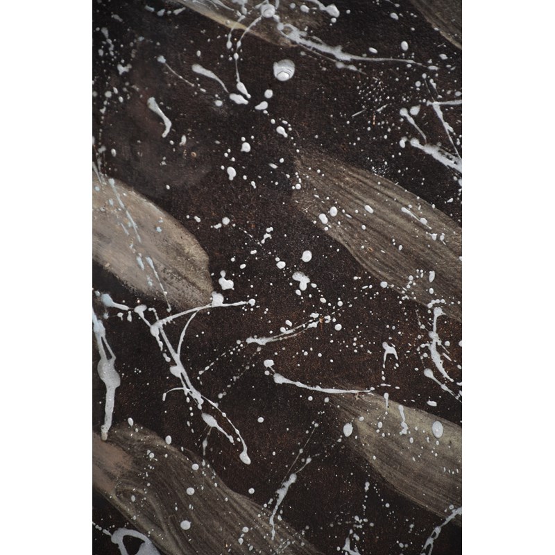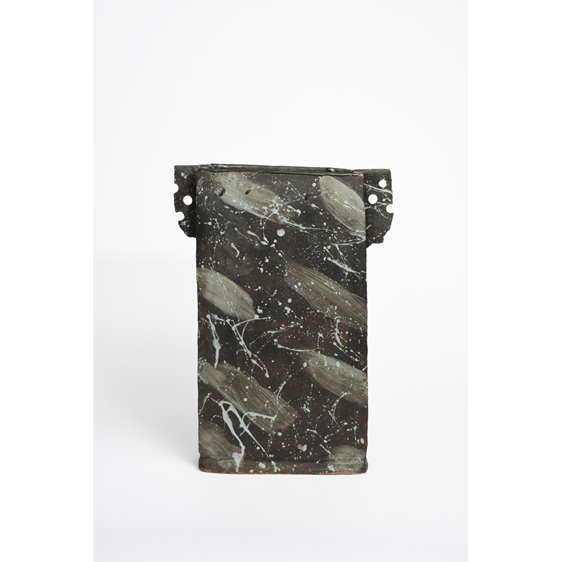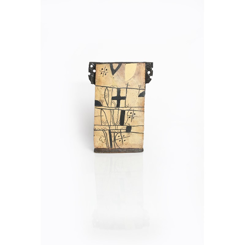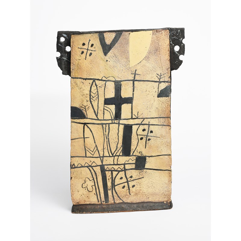 an early stoneware slab built twin-handled vase, painted with an abstract tree and cross design in black on a tan ground, the sides and back black with blue splashed design,