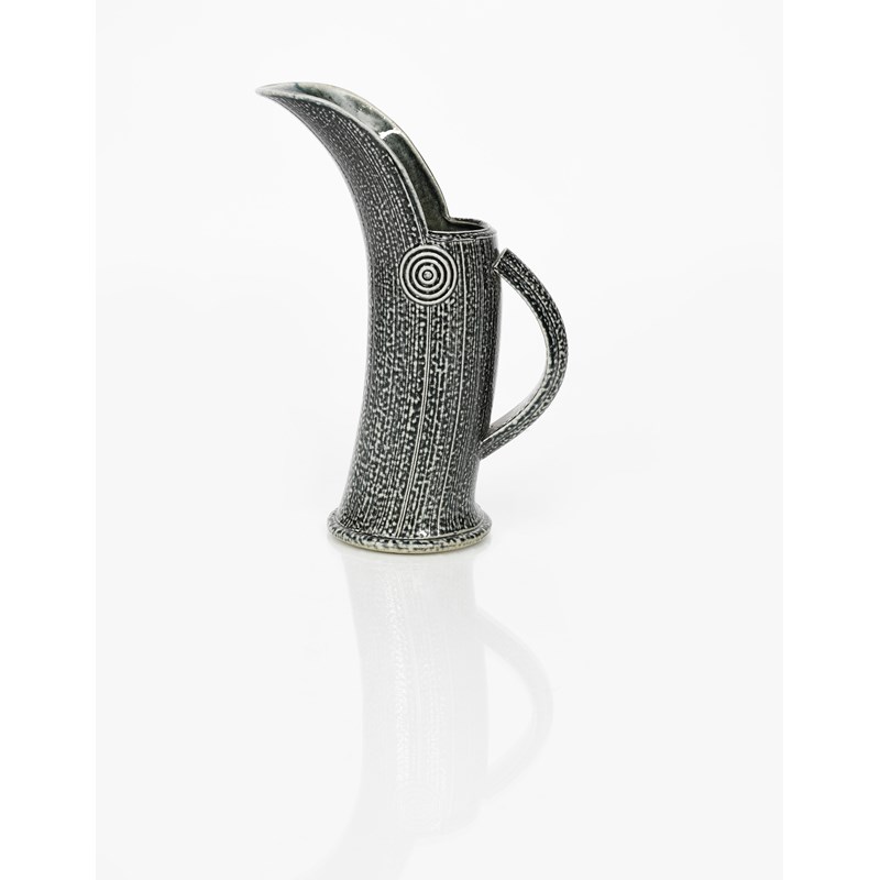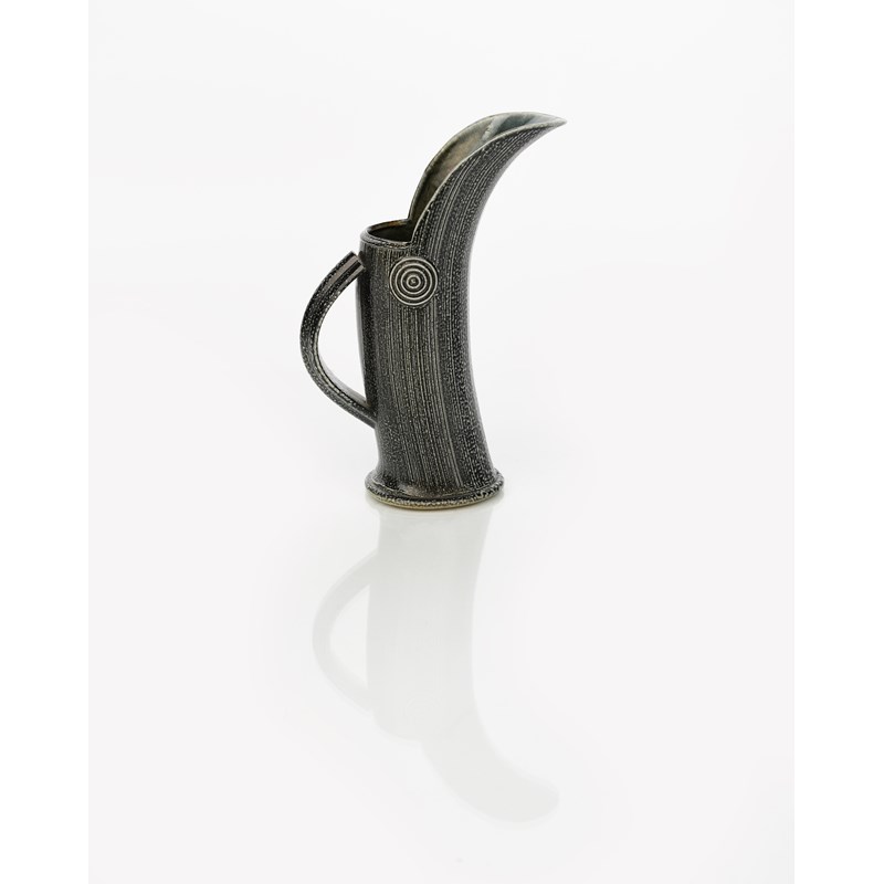 a salt glaze stoneware extruded jug, curved cylindrical form with applied strap handle, covered in a dark blue/grey glaze, impressed seal mark, 23cm. high