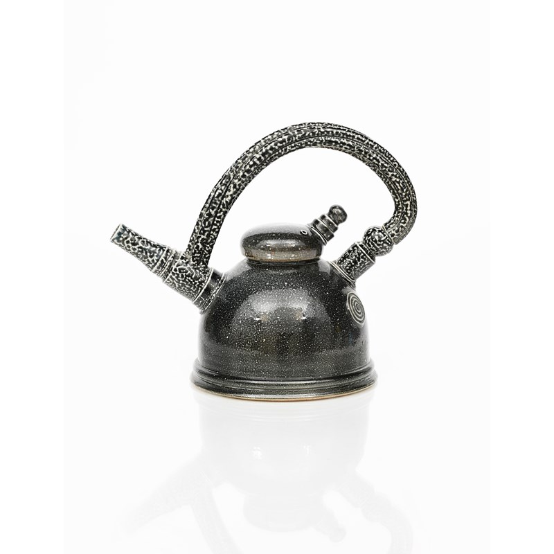 a salt glaze stoneware teapot and cover, domed form with gun-barrel spout and over-slung handle, covered in a dark blue/grey glaze, impressed seal mark, 20.5cm. high (2)
