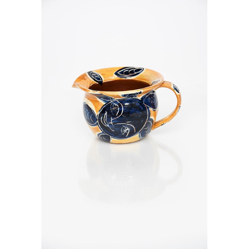 an earthenware jug, shouldered form with wide rim and applied handle, painted and with simple blue flowerheads on an orange ground,