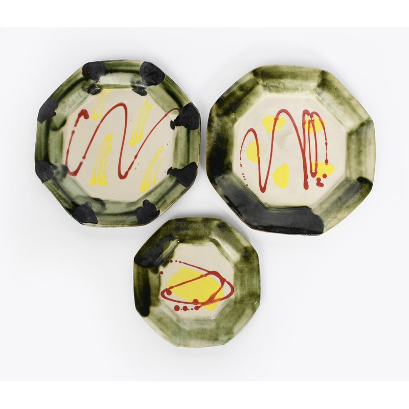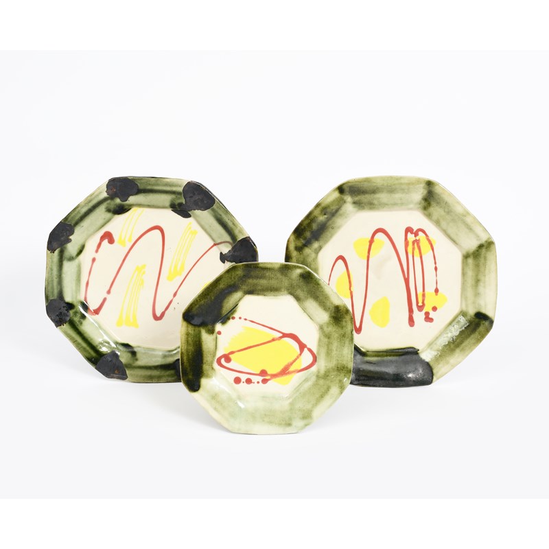 three earthenware octagonal plates, each decorated with red and yellow painted design inside green border to rim, comprising two large and one small plate incised signatures, 26.5cm. diam (largest), (3)