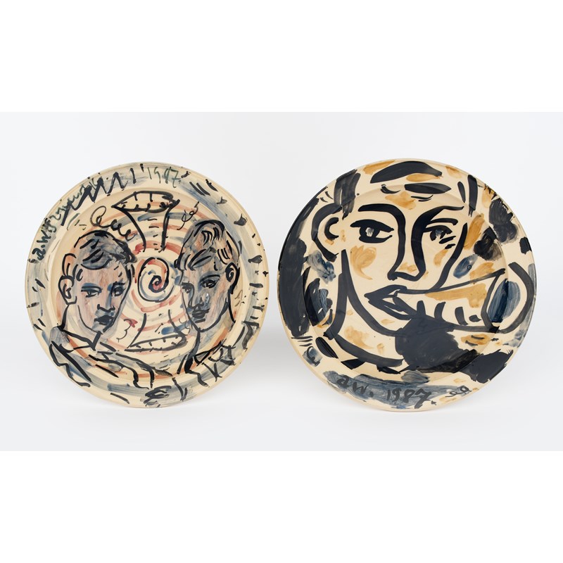 a pottery plate, painted in shades of blue and tan on a cream ground, and another painted with two boys,