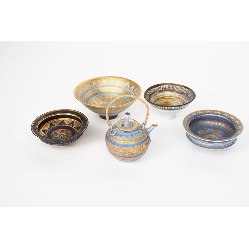 a small porcelain teapot and cover with over-slung handle, pale blue with gilt banded decoration, three Mary Rich bowls and a bowl by Marianne de Trey, impressed seal marks, 10cm. high, (6)