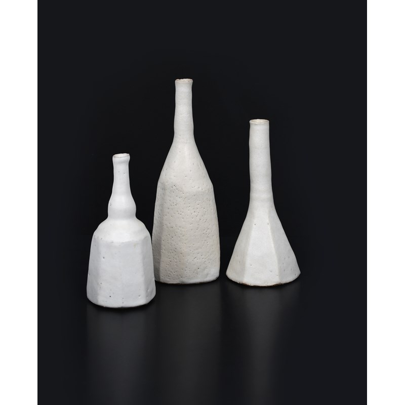 three solifleur bottle vases, each covered in a pitted white glaze, impressed seal mark, 22.5cm. high (tallest), (3)
