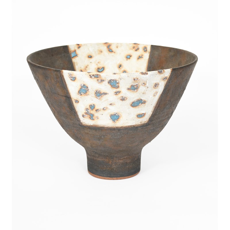a large stoneware footed bowl, painted with panels in white with raised blue spots, on matt black glaze to the foot, impressed RW seal mark, 27cm. high, 37.5cm diam.