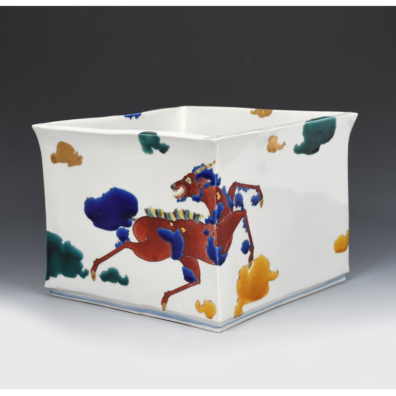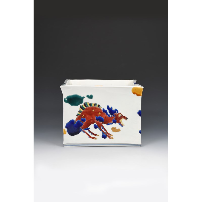 a porcelain planter, irregular square section, enamelled in colours with mythical beasts amongst clouds, in colours on a white ground, with gilt highlights, impressed seal mark, 23.5cm wide, 17.5cm. high