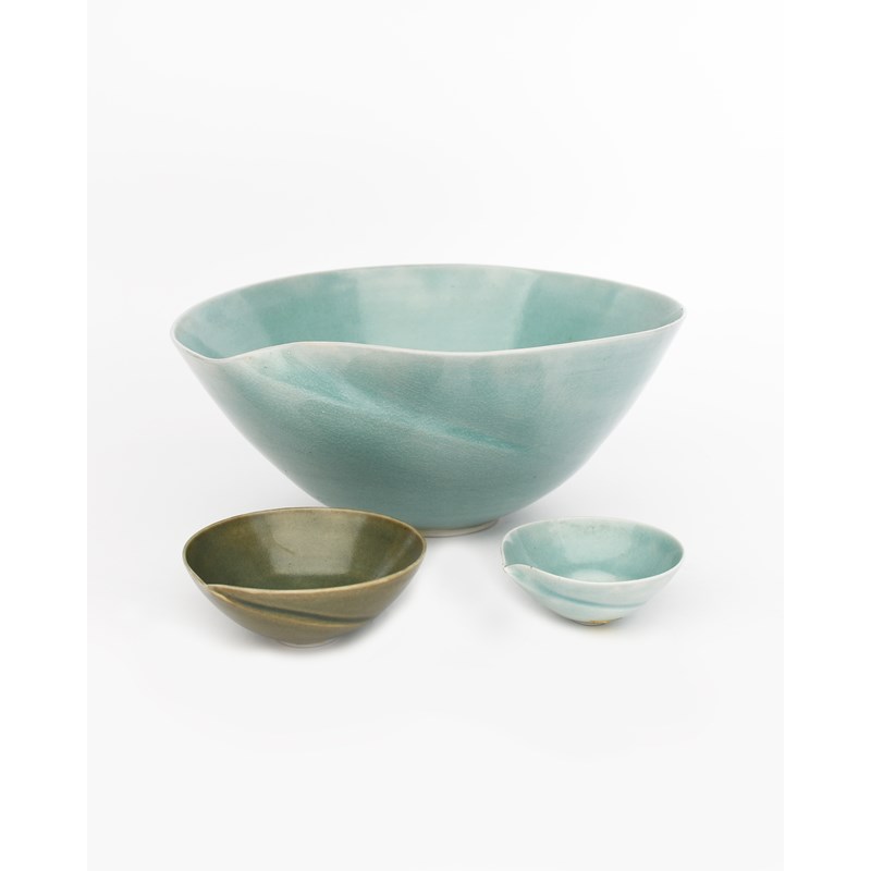 a large porcelain bowl with folded rim, covered in a pale blue glaze, another smaller and another small bowl with pinched rim covered in a celadon green glaze larger bowl unsigned, smaller bowls both incised monogram, 31cm. wide, 13.5cm. high (large bowl), (3)