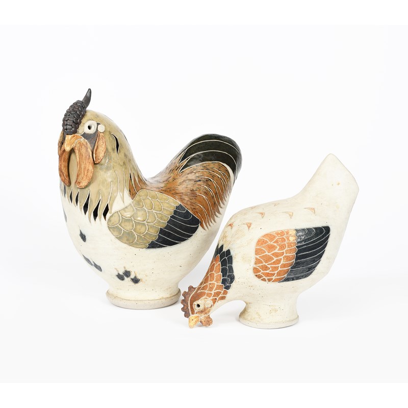 a stoneware chicken and cockerel, each modelled and glazed in colours impressed seal mark and painted artist mark, 35.5cm. high (cockerel), (2)