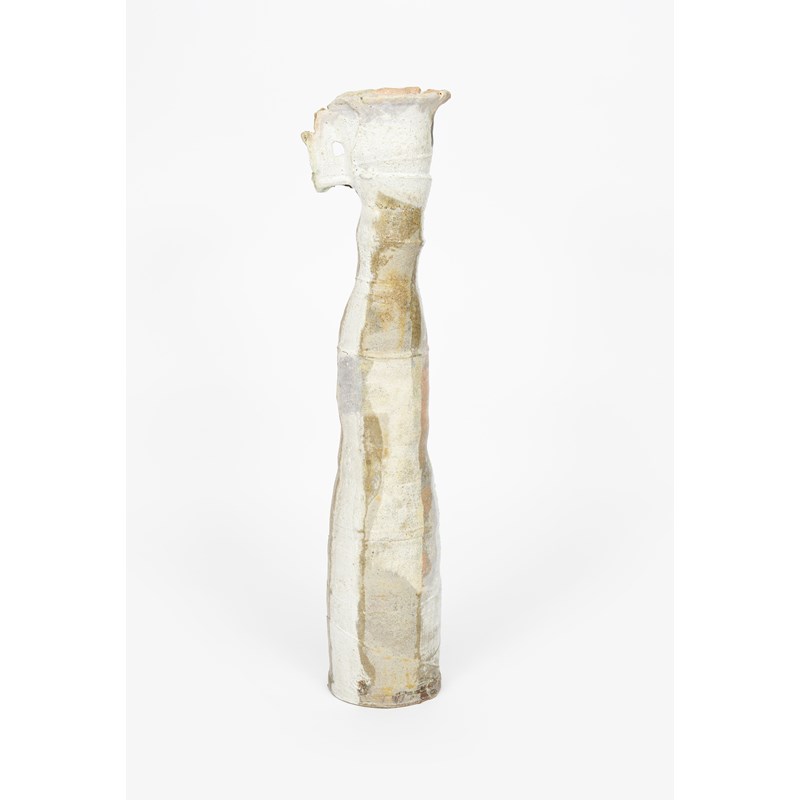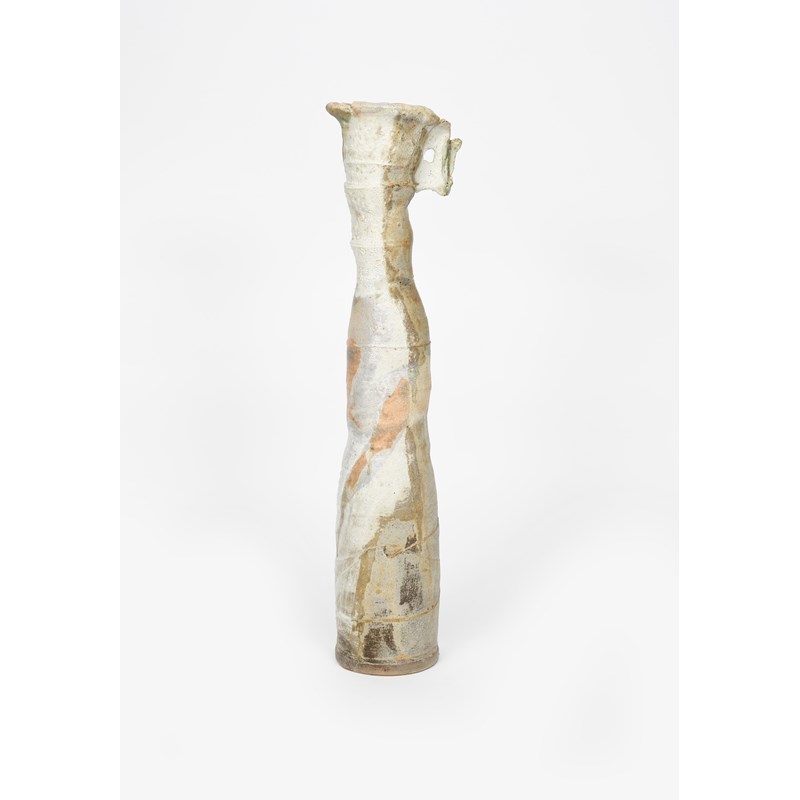 a tall stoneware ewer, with mushroom and white volcanic glaze, impressed seal mark, painted A27 56.5cm. high