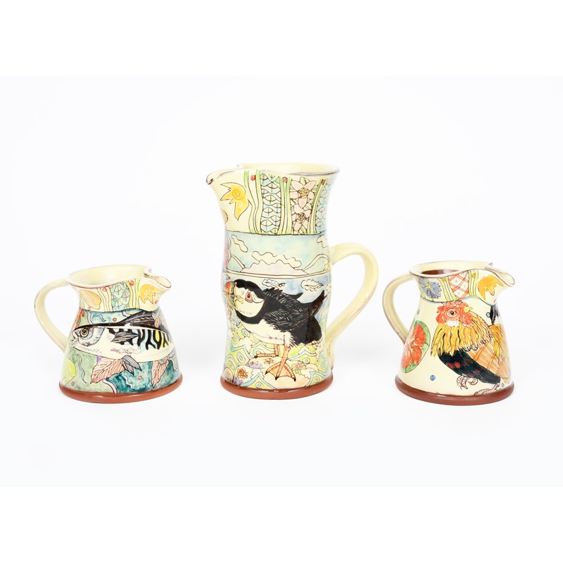 a slender, swollen jug, painted with a puffin and a herring, in colours, and two smaller jugs by Maureen Minchin painted with a herring and a cockerel, impressed seal mark, 17cm. high, (3)