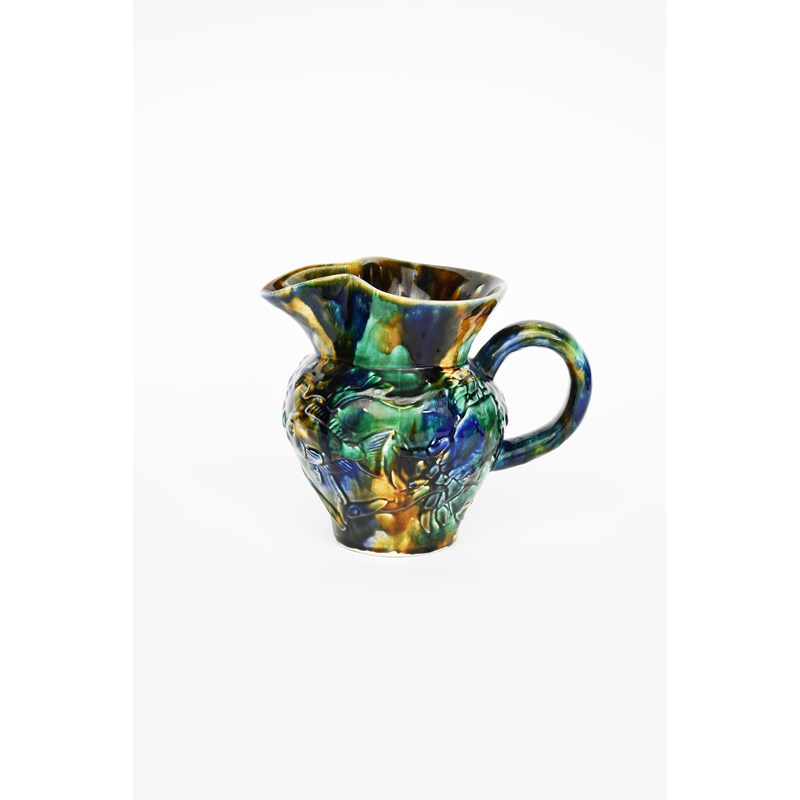 a large jug made in limited but not numbered run of approximately fifty, circa 1986, retailed by James Kent, modelled in low relief and covered in a streaked blue and green glaze,