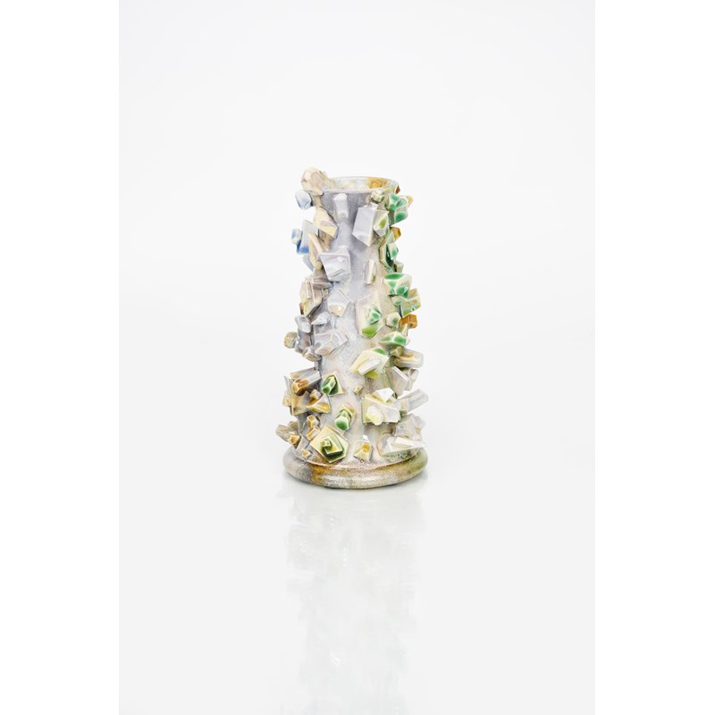a crystalline-glazed stoneware vase, dated 2014, with applied porcelain particles, glazed in streaks of colour incised Kate Malone 2014,