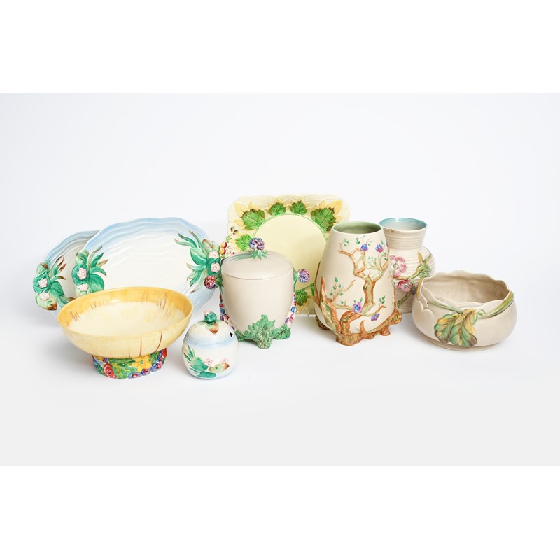'My Garden' a Clarice Cliff Bizarre pedestal bowl, moulded in relief with flowers, painted in colours, a biscuit barrel and cover similar, a preserve pot and cover and a collection of eight other Clarice Cliff moulded ware items including an 'Indian Tree' vase, printed factory marks, 21.5cm. diam. (13)