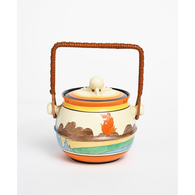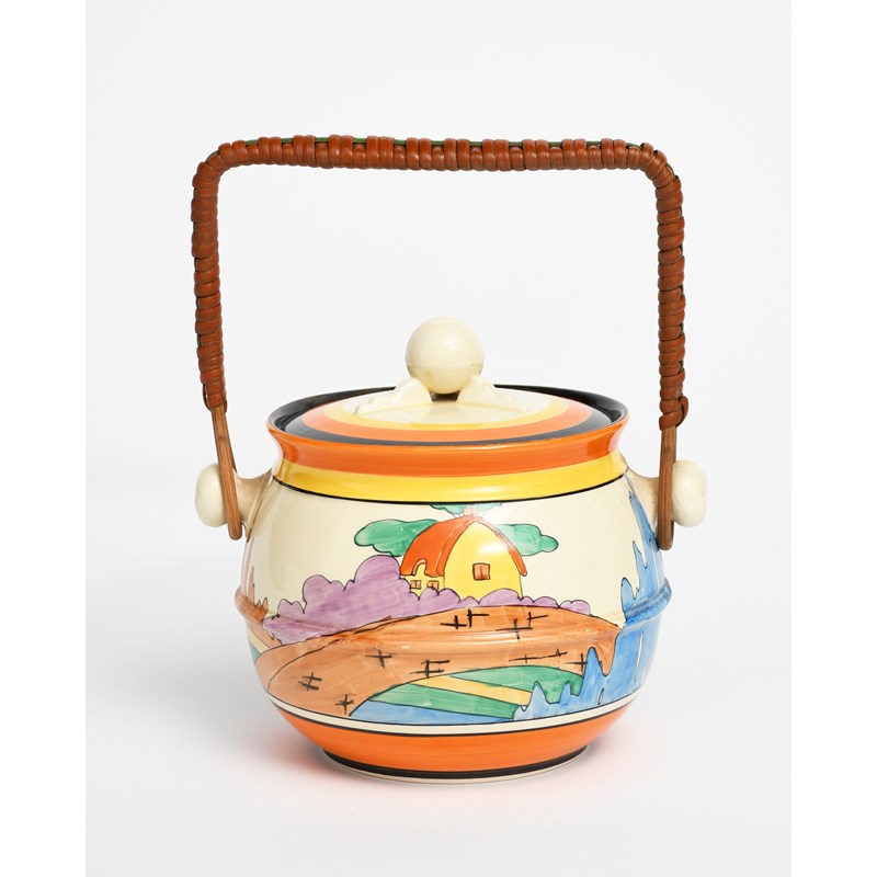 'Orange Roof Cottage' a Clarice Cliff Bizarre biscuit barrel and cover