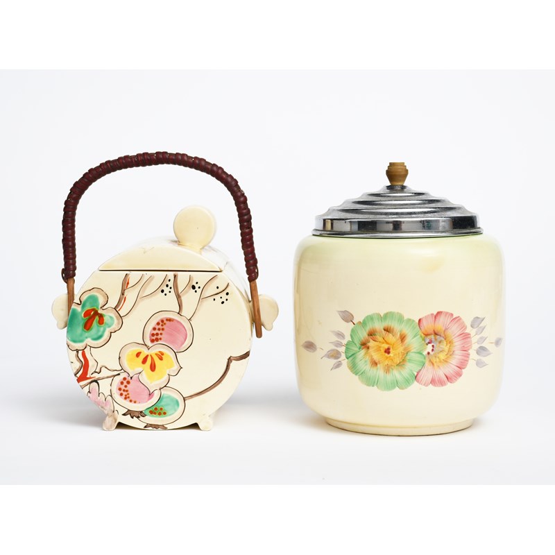 'Passionfruit' a Clarice Cliff Bonjour biscuit barrel and cover, painted in colours, with wicker handle, and another biscuit barrel with electroplated cover, painted with flowerhead motif, printed factory marks, minor nicks to cover, 14.5cm. high (4)